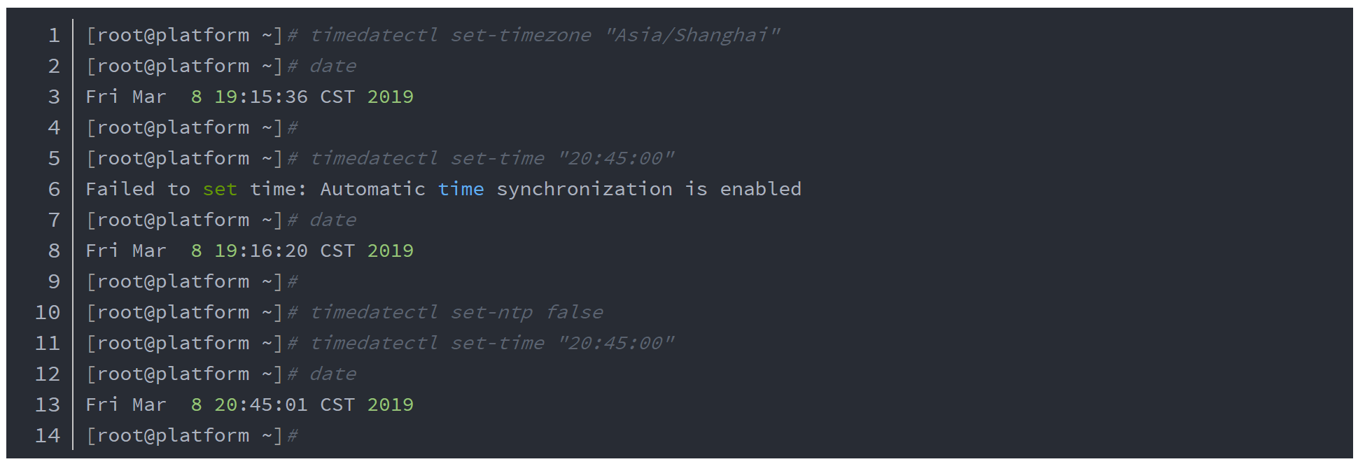 - 设置日期:timedatectl set-time YYYY-MM-DD