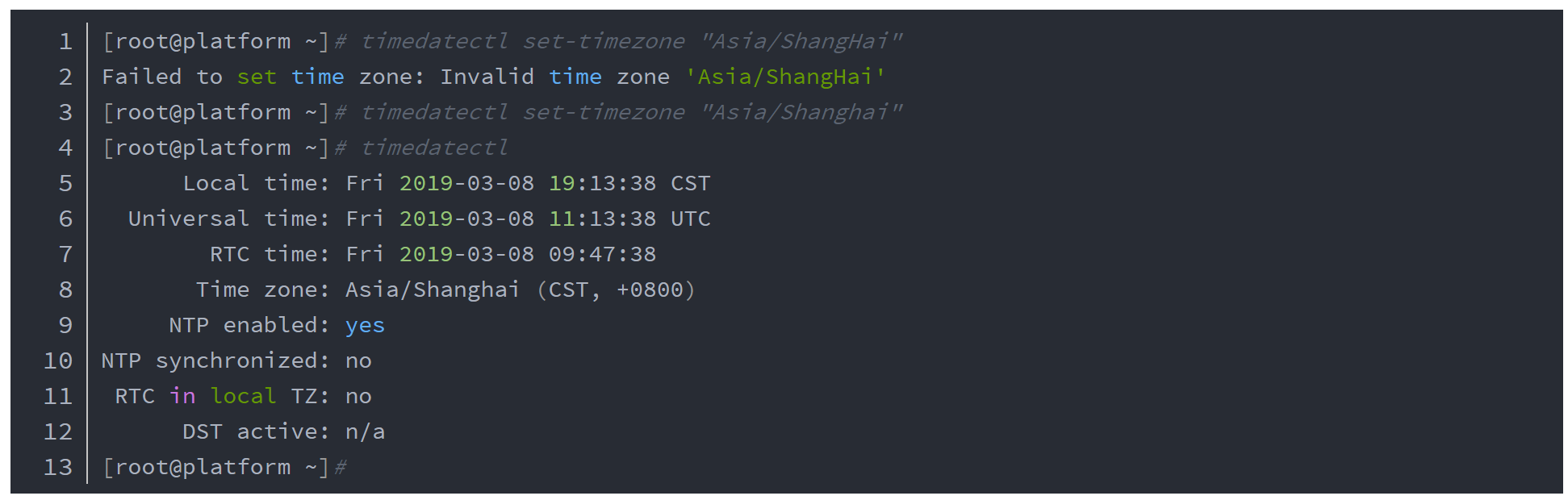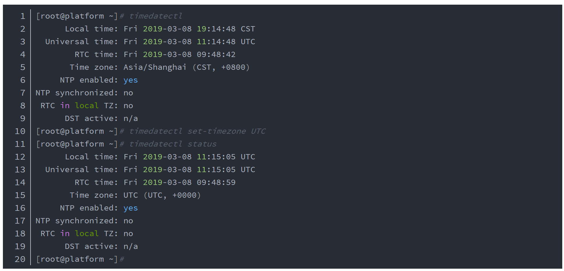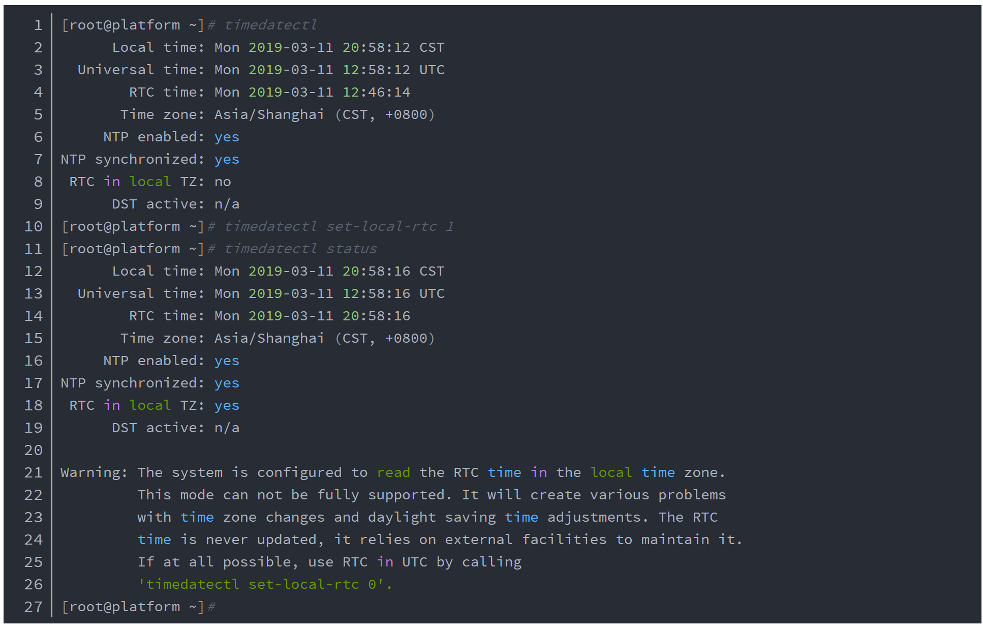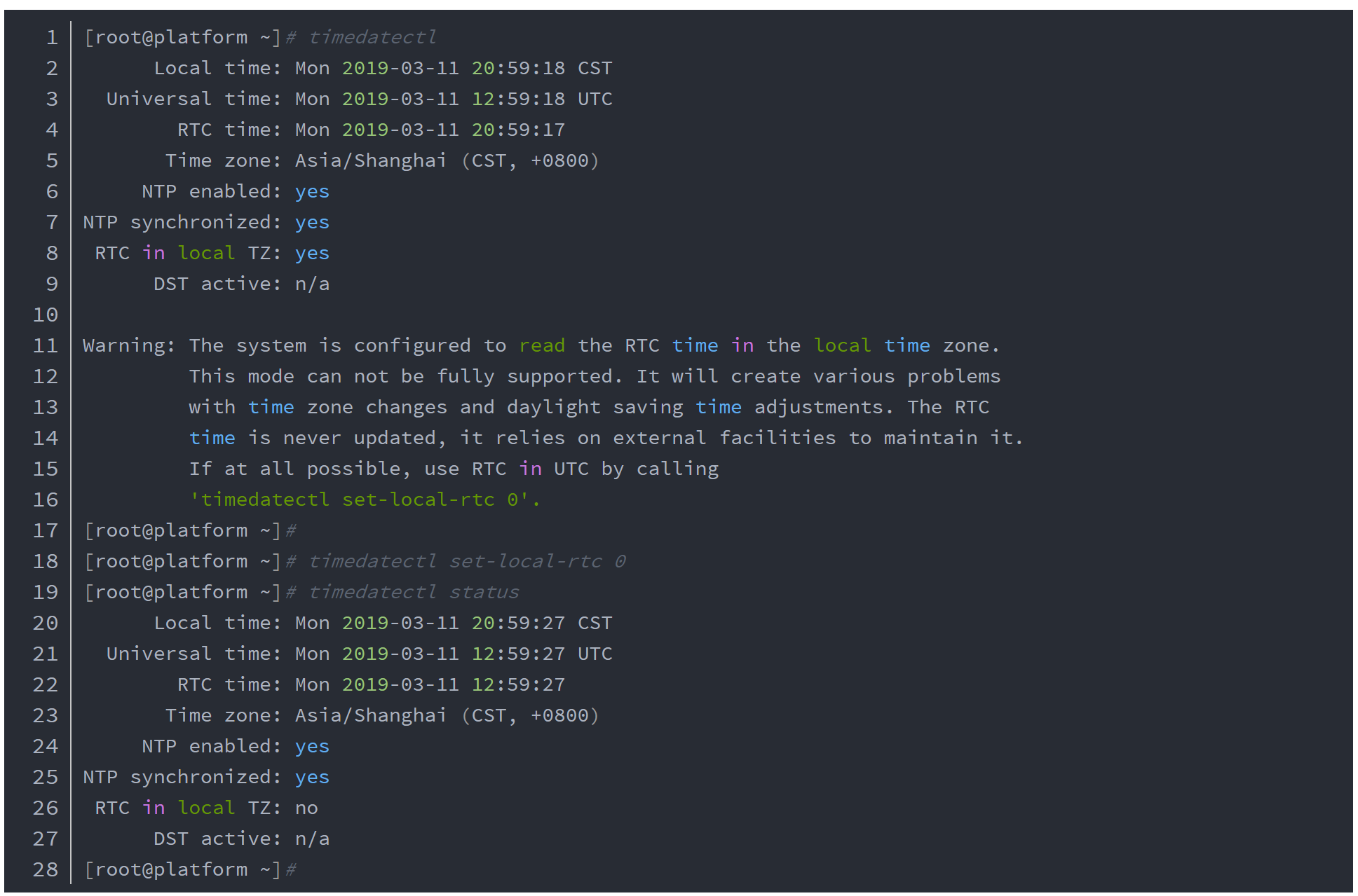 - 设置硬件时钟为UTC时间:timedatectl set-local-rtc 0