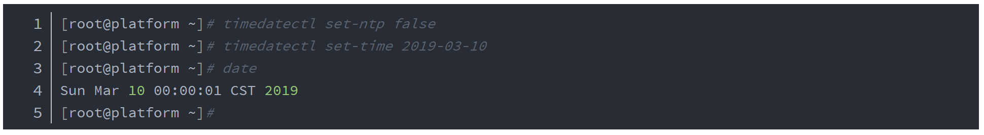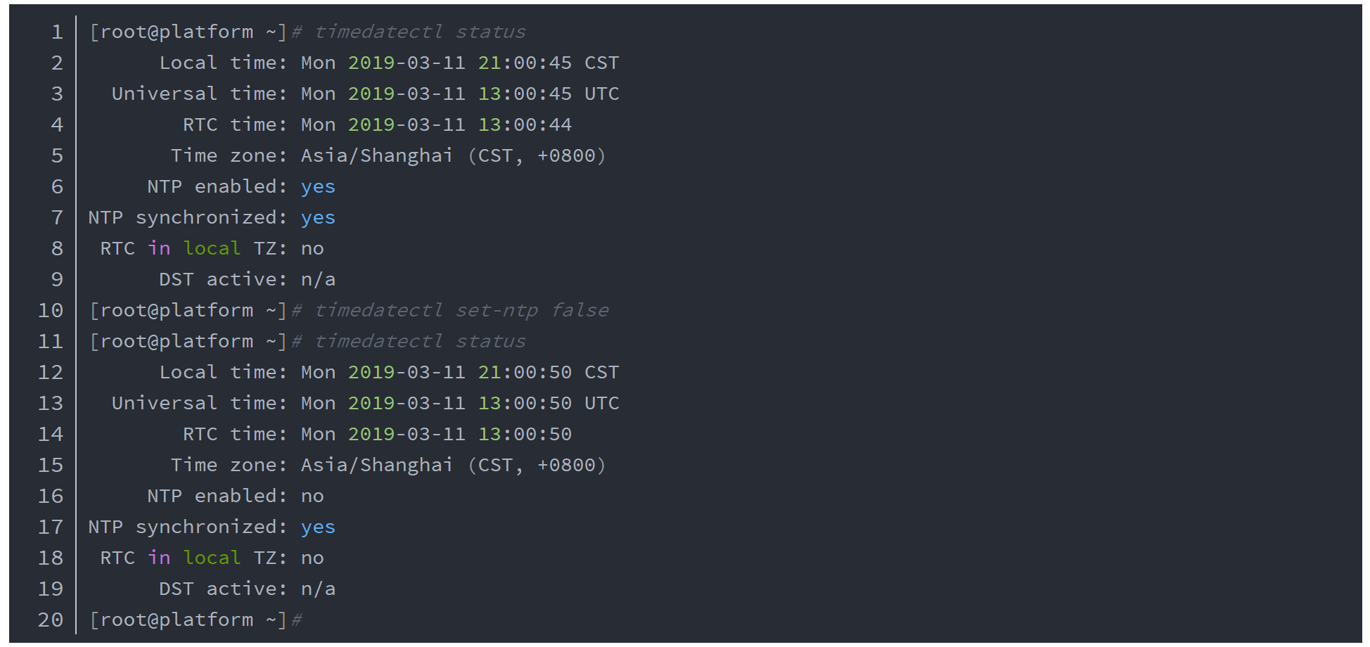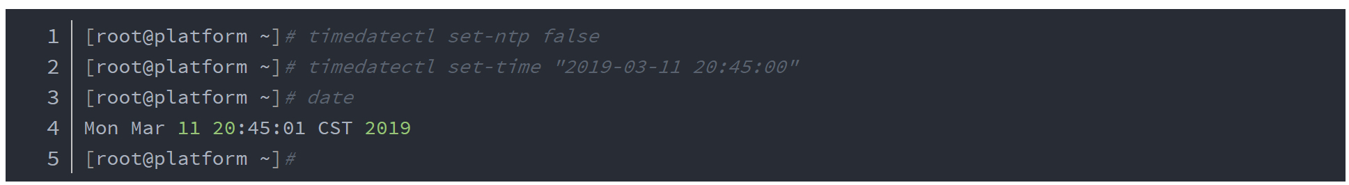 - 禁用NTP时间同步:timedatectl set-ntp false