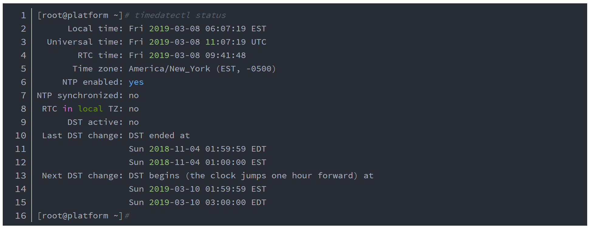- 查看当前时间/日期/时区:timedatectl或者timedatectl status